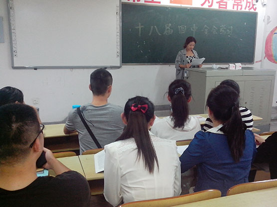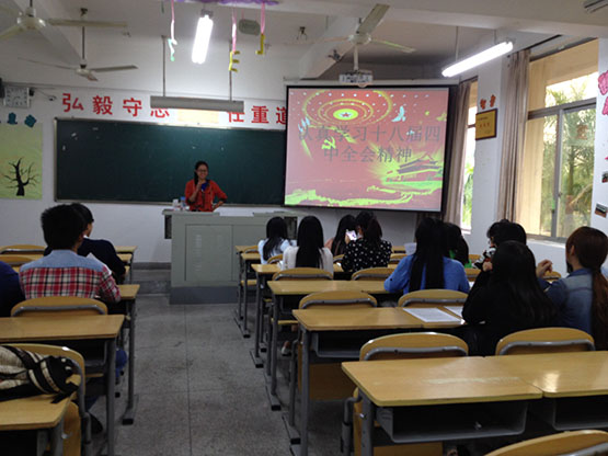 为了全方位组织学生党员及入党积极分子深入学习党的十八届四中全会精神,从10月28日起,ok138cn太阳集团学生党建中心积极策划,通过“线上、线下”两条渠道多种载体广泛组织学生党员及入党积极分子开展学习讨论活动,营造了良好的理论学习氛围。通过“数统学院学生党建中心”微博平台及时转载《中共中央关于全面推进依法治国重大问题的决定》,借助网络平台开展了激烈的微博互动讨论。11月2日,学院分党校借助培训的有利时机,及时组织第七期全体学员以小组为单位广泛开展学习党的十八届四中全会精神活动,各组通过PPT展示、报告、辩论、心得体会交流等形式深入学习了十八届四中全会精神,加深了对依法治国的进一步理解。同时,还组织下班党员、下宿舍党员以班级和宿舍党章理论学习小组为阵地,带领学生掀起学习党的十八届四中全会精神的热潮,引导学生紧跟时事,把自己的人生梦与构建中国特色社会主义法治社会紧密结合起来。