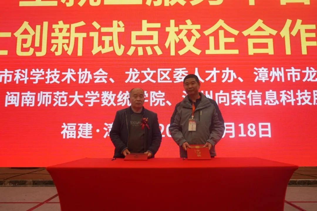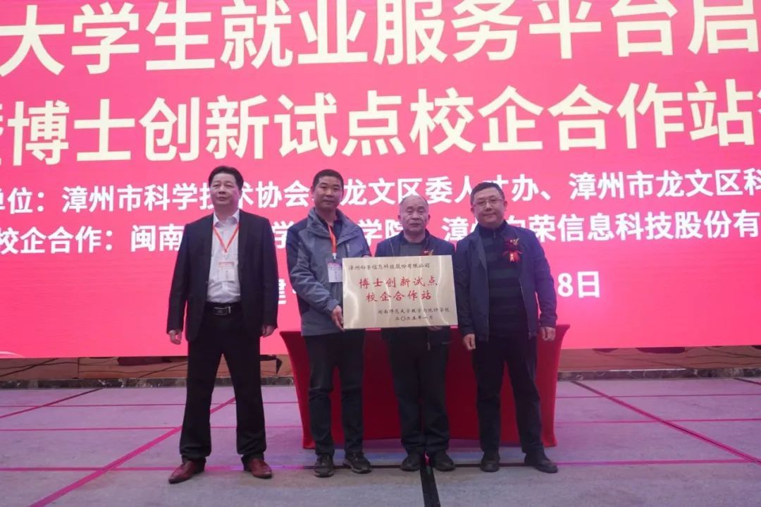 在与会嘉宾的共同见证下,ok138cn太阳集团与漳州市向荣信息科技股份有限公司共同为“博士创新试点校企合作站”揭牌。