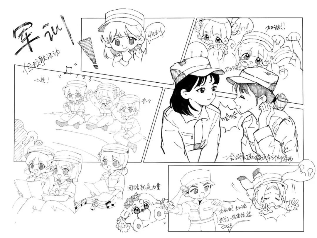 我们用漫画勾勒出军训的时光轮廓,定格那些既艰辛又充满乐趣的难忘瞬间。彩色的画页间,青春的印记被永恒保存。