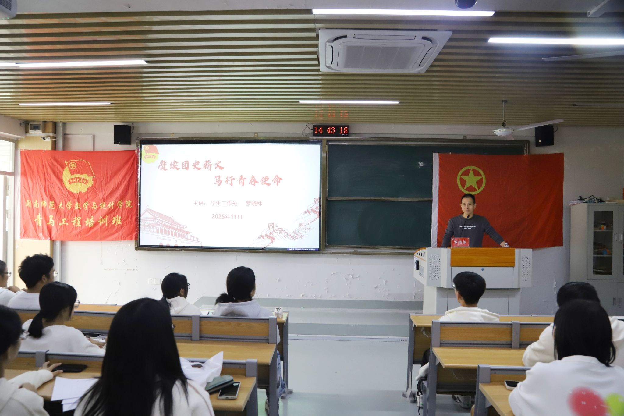 讲座中,罗晓林老师以团史发展的时间轴为脉络,串联起不同历史时期的背景与典型案例,生动勾勒出共青团从诞生到发展壮大的奋进轨迹,深刻阐释了其始终不变的初心使命。他强调,共青团百年来始终与党同心、与国同行,永葆蓬勃生机的核心密码有三:一是把党的领导作为根本遵循,确保发展方向不偏航;二是以组织革新回应时代需求,激活内生发展动力;三是靠一代代青年接续奋斗,注入源源不断的青春活力。