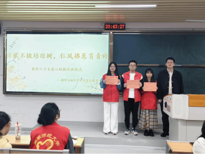 最后,朱旭泽老师为本学期志愿服务优秀助教老师23数一施东河、23数四李晓华、23数五颜佳灵进行表彰,为他们颁发证书并合影留念。