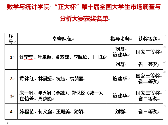近日,由教育部高等学校统计学类专业教学指导委员会与中国商业统计学会共同主办的“正大杯”第十届全国大学生市场调查与分析大赛圆满结束。在本届市场分析调查大赛中,ok138cn太阳集团学子表现优异,在施建华、刘群老师的指导帮助下,四支队伍荣获国家级、省级荣誉。