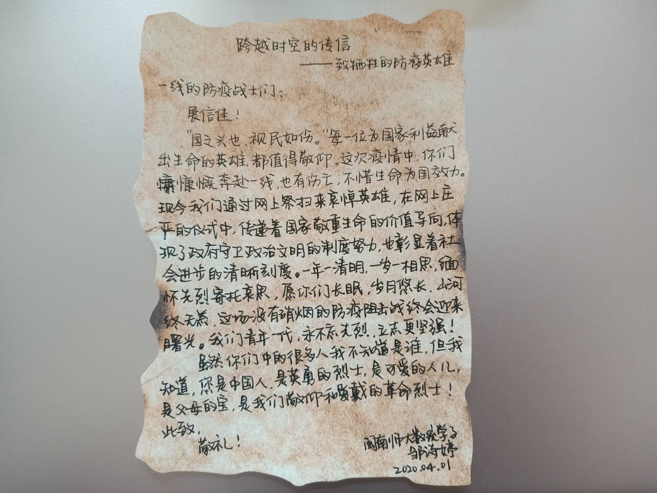为缅怀此次疫情中牺牲的战疫英雄,我院艺术团于4月1日至4日举办“缅怀革命先烈,致敬时代英雄”活动,参与活动的学生通过书信、电子信、心得等形式向此次疫情中牺牲的战疫英雄抒发缅怀之情。
