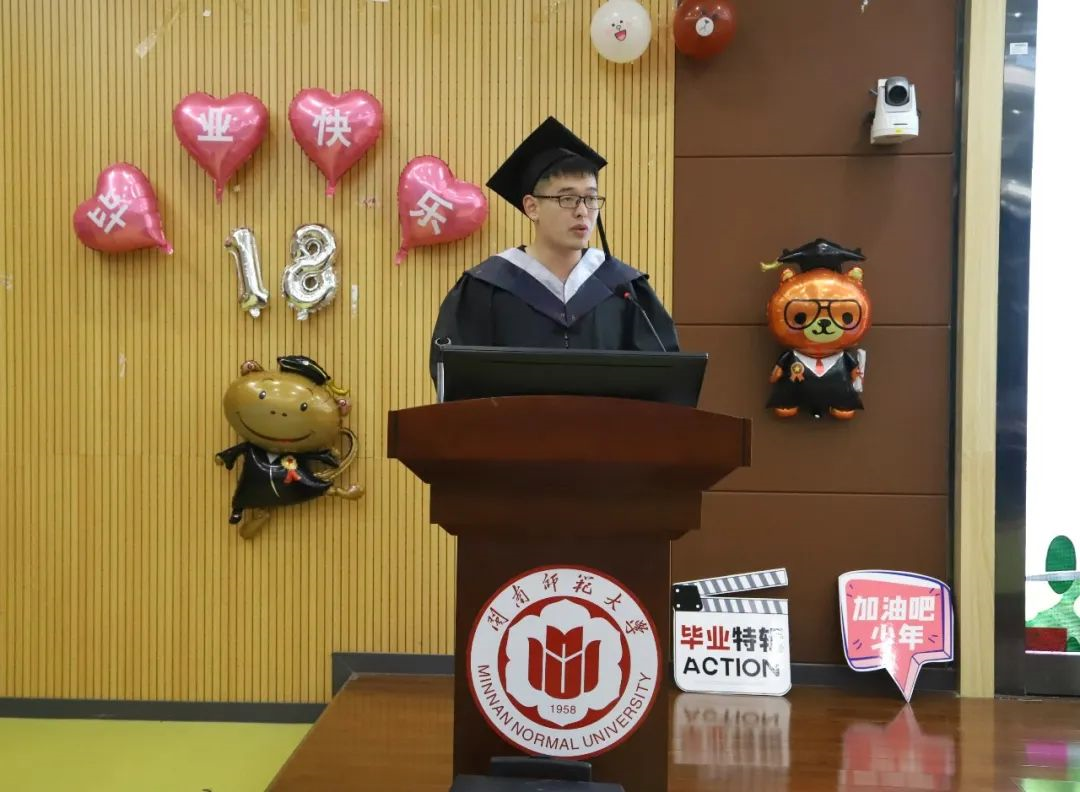 随后毕业生代表林俊荣、薛蓝琦上台发言,向学校、学院、科任老师、辅导员表达由衷的感谢,向四年以来携手并进的同学们致以最美好的祝福,期待同学们前途光明,前程似锦,蓬勃发展,再书华章。