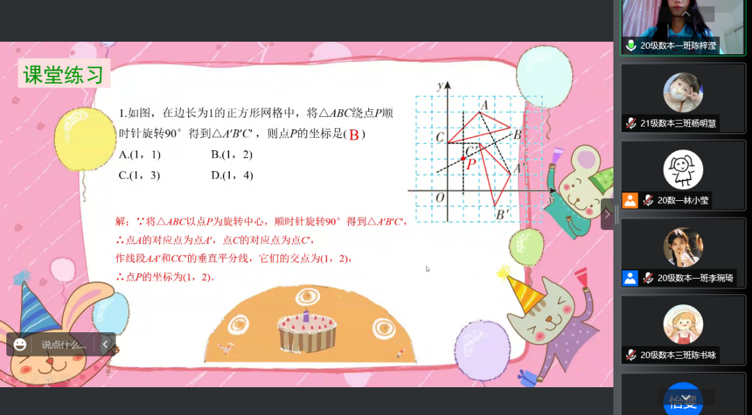 在图形旋转的讲解课堂上,实践队员为同学们讲解了图形旋转的定义、性质以及相关内容。通过生动的图形变换使同学们了解到了旋转的奥秘,相关例题的讲解使同学们更好的掌握了旋转的相关解题方法。课堂上同学们积极参与、自主探究、踊跃互动。网课的课堂氛围轻松愉快,在一步步讲解的同时培养了同学们学会观察、学会分析、学会判断、学会归纳等解决问题的能力。