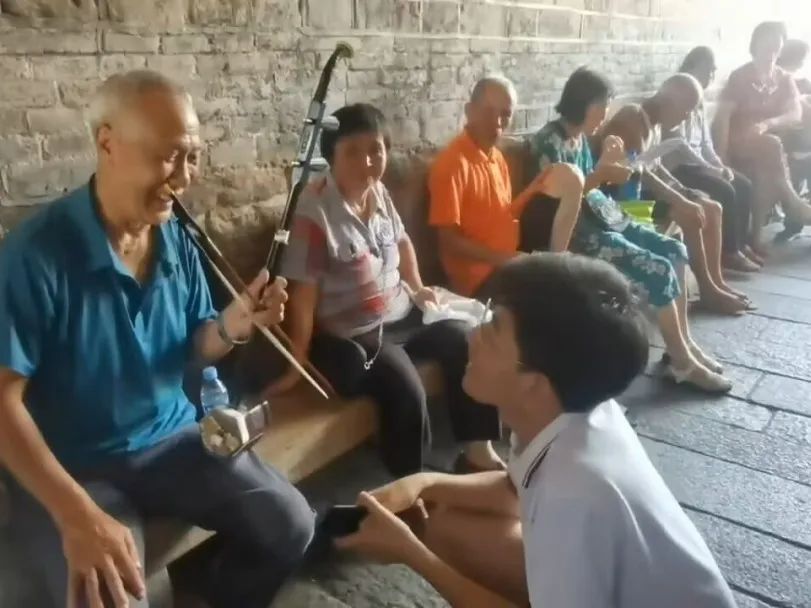 “风吹竹叶响叮当噢,旧年红军涂坊上噢,朱德打得汀州破噢,打得敌人一扫光噢。风吹竹叶响叮当噢,自动报名上前方噢,前方打倒反动派噢,缴了几多机关枪噢。”7月11日下午,观察团成员来到三元阁向爷爷奶奶学习客家民谣,铿锵有力的歌声在窄窄的桥洞中回荡流转,当地居民们所呈现出的热情好客、爱国爱乡的精神面貌也深深感染着观察团成员们。