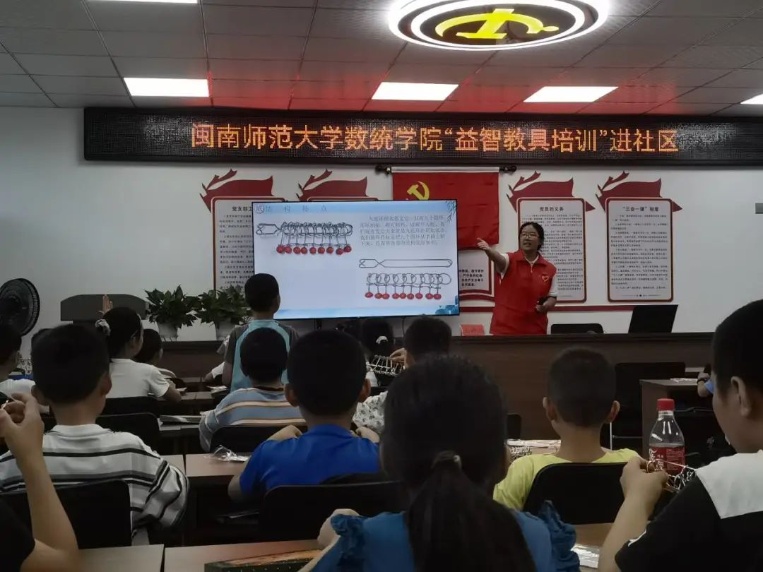 7月11日上午,实践队成员在社区开展了“常青数 快乐学”益智教具培训活动进社区,通过PPT、视频来介绍九连环及其解法,实践队成员亲自演示,带领学生们体验九连环的玩法,让学生们在实践和体验中探索益智教具蕴含的数学规律和知识,感受九连环的奥妙之处,提高了动手能力和协调能力,激发学生们对数学的兴趣,引导他们在数学中探索更多未知奥秘。
